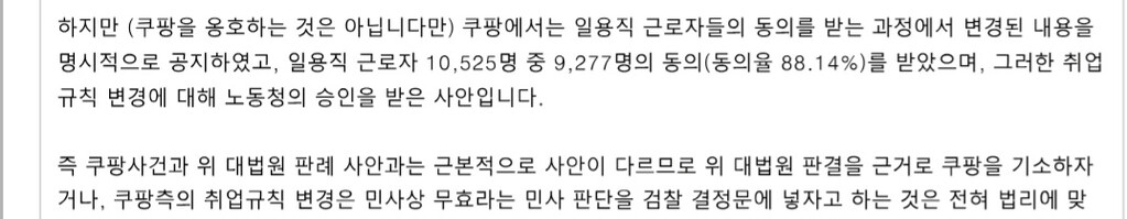 다시 본론으로 돌아와 엄희준 검사가 내부 커뮤니티에 올린 글을 자세히 살펴보면 “쿠팡 일용직 근로자의 동의를 받는 과정에서 변경된 내용을 명시적으로 공지했고, 일용직 근로자 1만525명 중 9277명의 동의(동의율 88.14%)를 받았으며, 그런 취업 규칙 변경에 대한 노동청의 승인을 받은 사안이다”고 적었다.
