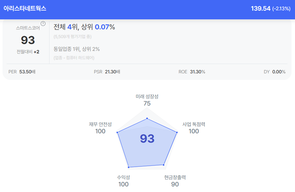 | 아리스타네트웍스 종목진단 (출처=초이스스탁) |