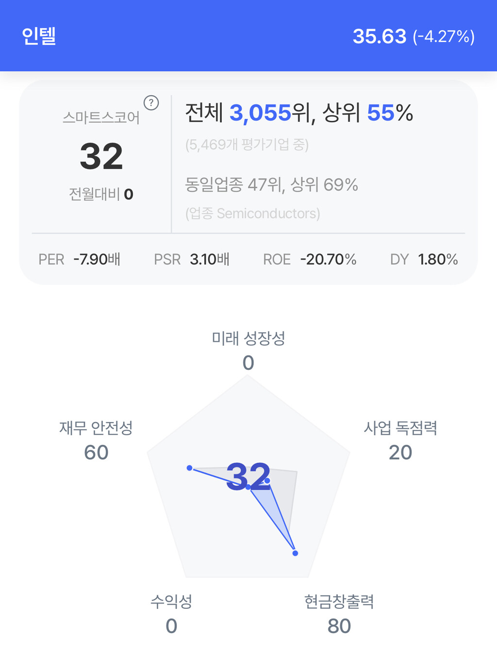 인텔 주가는 35.63달러로 4.27% 하락 마감했다.