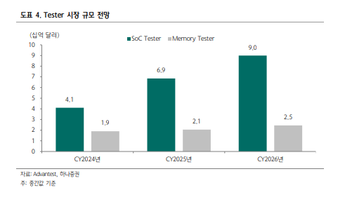 2025년 대비 31% 증가한 규모이다. 2025년에 이어 2026년에도 AI 수요를 기반으로 SoC 테스터 시장은 고성장을 이어갈 것으로 제시했다.