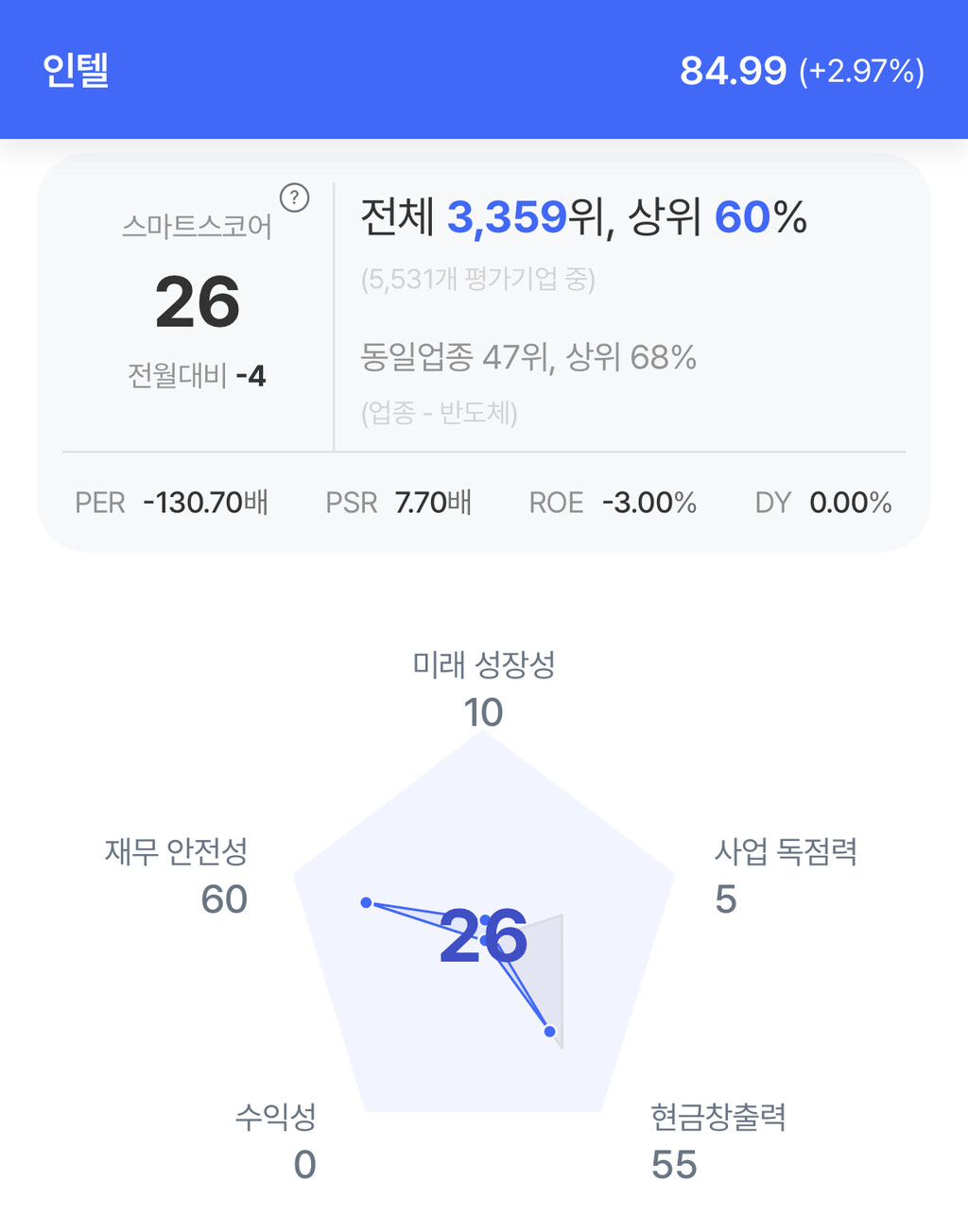 인텔 주가는 84.99달러로 2.97% 상승 미감했다.