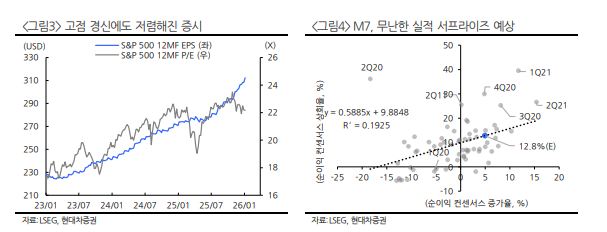 다음주에는 금융 업종을 필두로 4분기 어닝 시즌이 도래한다. 금융 업종에 뒤이어 M7 종목들의 실적 발표가 예정된 가운데, 최근 이들의 이익 추정치 모멘텀은 순이익 기준 상위 25% 수준(2010년 이후)의 무난한 실적 서프라이즈를 시사하고 있다.