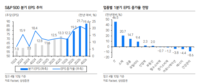 삼성증권에 따르면, 현재 S&P 500 1분기 주당순이익(EPS) 증가율은 전년 대비 12.2% 증가할 것으로 전망된다. 업종별로는 IT(+46.5%), 소재(+20.7), 금융(+14.7) 등이 전년 동기 대비 크게 증가하는 반면 건강관리(-8.6%), 에너지(-4.4), 커뮤니케이션(-3.8) 등의 업종 이익은 감소할 것으로 추정된다.