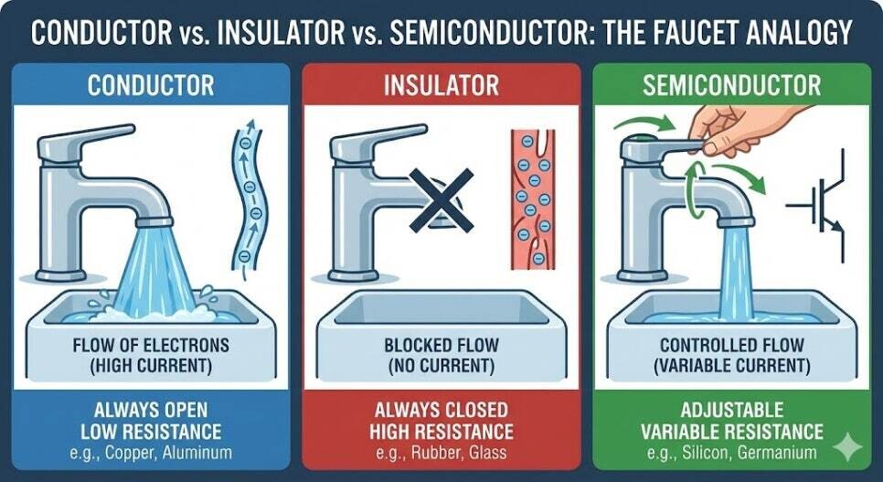 전기가 잘 통하는 '도체'와 통하지 않는 '절연체'의 중간 성질을 띠며, 외부 조건(전압, 온도 등)에 따라 전기 흐름을 조절할 수 있다.