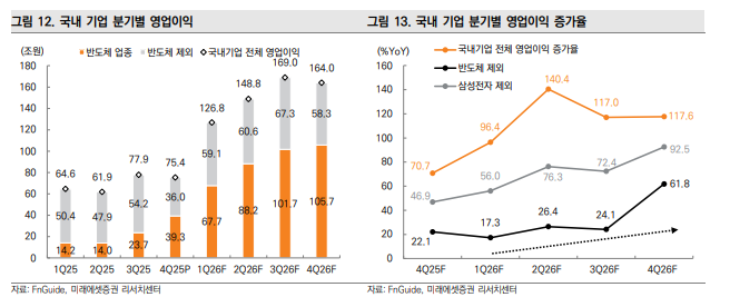 이번 1분기 실적이 중요한 이유는 SK하이닉스, 삼성전자의 영업이익률이 사상 최고치를 넘어설 전망이고, 1분기가 전분기 대비 증가율 모멘텀이 가장 크기 때문이다. 반도체를 제외한 업종의 영업이익 증가율도 1분기를 저점으로 회복이 기대된다.