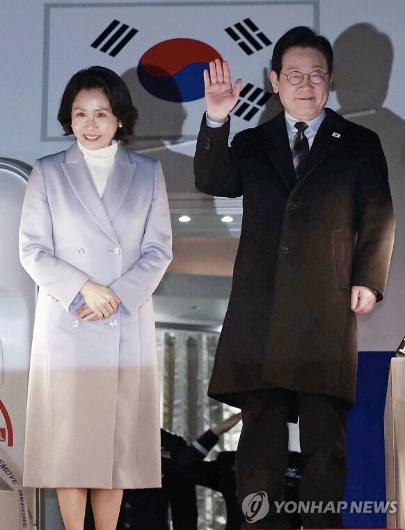 | 중국 방문 공식일정을 마친 이재명 대통령과 김혜경 여사가 7일 상하이 푸둥 공항 한국행 공군 1호기에서 환송객에게 인사하고 있다. (사진=연합뉴스) |