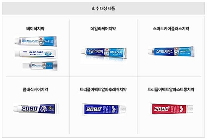 8일 유통업계에 따르면 애경산업은 홈페이지를 통해 ▲2080 베이직치약 ▲2080 데일리케어치약 ▲2080 스마트케어플러스치약 ▲2080 클래식케어치약 ▲2080 트리플이펙트알파 후레쉬치약 ▲2080 트리플이펙트알파 스트롱치약 등 총 6개 품목의 치약에 대한 회수 안내문을 게시했습니다.