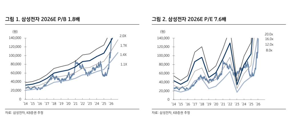 김동원 연구원도 "현재 삼성전자 주가는 2026년 PER 7.6배, PBR 1.8배로, D램 업체 대비 평균 47% 할인 거래되고 있어 글로벌 D램에서 가장 매력적인 선택지로 판단된다"라고 덧붙였다.