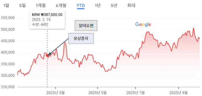 그는 이어 “알테오젠은 그간 시총 25조원의 기업답지 않게 미풍에도 심하게 출렁거렸다”면서 “대표적인 사례가 올 2월의 1500억원대의 유상증자였다”고 덧붙였다.