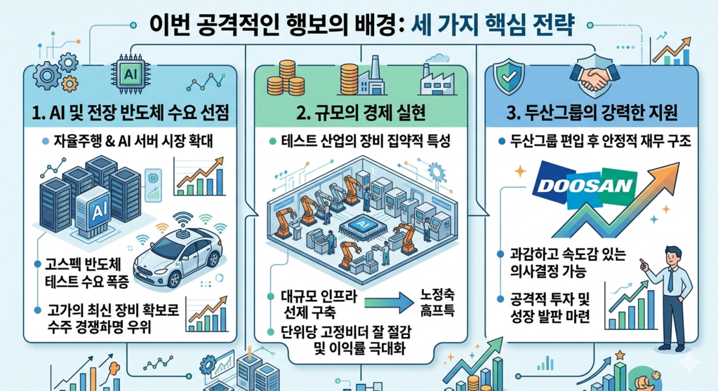 이어 “테스트 산업은 장비 집약적 사업으로 대규모 인프라를 선제적으로 갖춤으로써 단위당 고정비를 낮추고 이익률을 극대화하려는 전략”이라면서 “두산그룹 편입 이후 안정적인 재무 구조를 바탕으로, 과거보다 훨씬 과감하고 속도감 있는 의사결정이 가능해졌다”라고 분석했습니다.