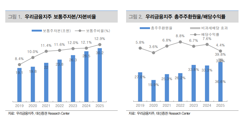 유준석 흥국증권 연구원은 "목표 CET1 비율을 조기 달성함으로써 주주환원 확대의 구조적 기반이 마련되었다"라며 "하반기 2500억원 추가 자사주 매입과 함께 2026년 총주주환원율은 48.0%에 이를 것"으로 전망했다.