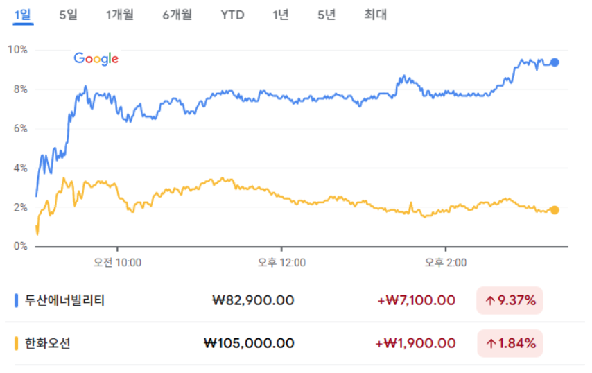 전날 한화오션이 5% 이상하락했다가 이날 반등은 1.84%에 그쳤다. 반면 두산에너빌리티는 9% 이상 올랐다.