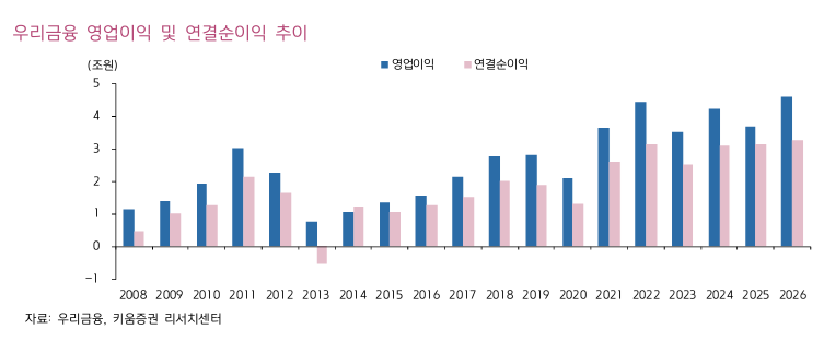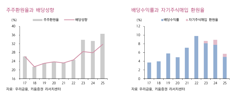 김은갑 연구원은 "비과세 배당에 의한 투자자 효익 증가는 타 은행주의 감액배당이 제도화되기 전까지는 약 1년간 우리금융만 누릴 수 있는 장점이다"라며 "2025년 말 보통주 자본비율은 12.9%이며, 최근까지 보통주 자본비율을 빠르게 상승시켜 온 관리능력을 감안하면 13% 초과 및 추가 자기주식 매입을 충분히 기대해볼만 하다"라고 판단했다.