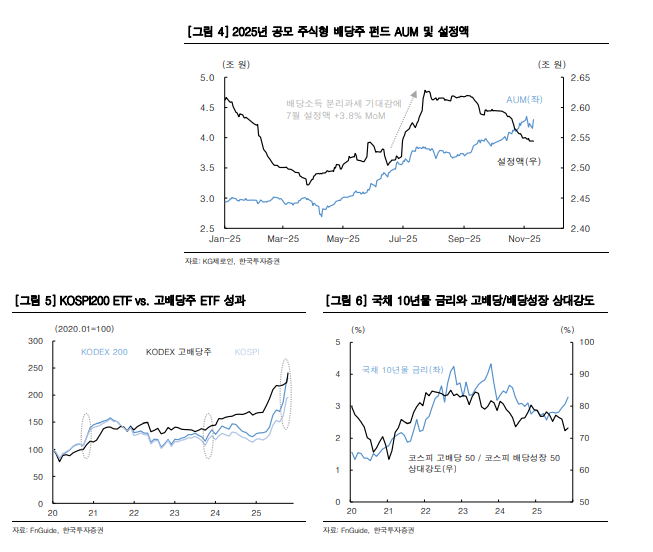 올해 7월 배당소득 분리과세 정책에 대한 기대감에 배당주 펀드로 자금이 유입되었던 사례에 비추어, 세율이 낮아진다면 고배당주와 배당성장주에 대한 투자자들의 수요가 증가하여 배당주로의 자금 유입이 재개될 수 있을 것으로 전망된다.