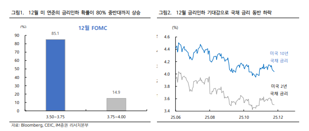 박상현 IM증권 연구원은 "12월 초중반 금융시장 변동성 축소 전망에 중요한 근거는 12월 FOMC 회의에서 금리인하 결정"이라며 "아직 속단하기 이른 시점이지만 인하 분위기가 확산되고 있음은 긍정적 신호"라고 판단했다.