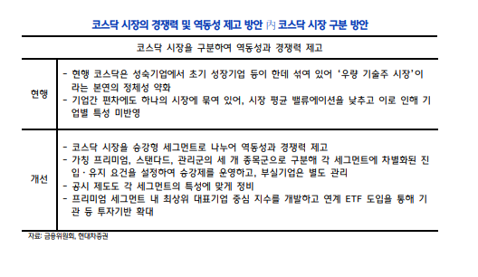 현대차증권에 따르면, 핵심은 코스닥을 성장 단계와 시장 품질에 따라 구분된 복수 리그로 재설계하겠다는 것으로 예시안으로는 프리미엄·스탠다드 및 관리군 체계가 제시됐다.