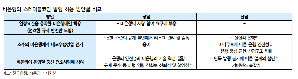 국내에서 비은행의 스테이블 코인 발행 방안은 ▲일정요건을 충족한 비은행에만 허용, ▲소수의 비은행에게 내로우뱅킹업 인가, ▲비은행이 은행권 중심 컨소시엄에 참여하는 방안 등 3가지가 논의되고 있다.