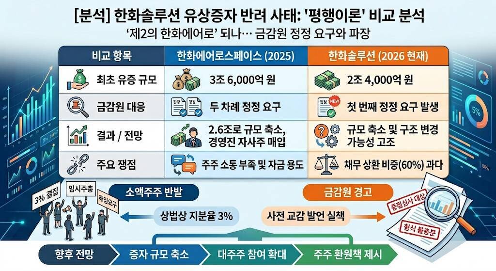 한화솔루션 사태는 지난해 한화에어로스페이스의 유상증자 과정과 놀라울 정도로 닮아 있습니다.