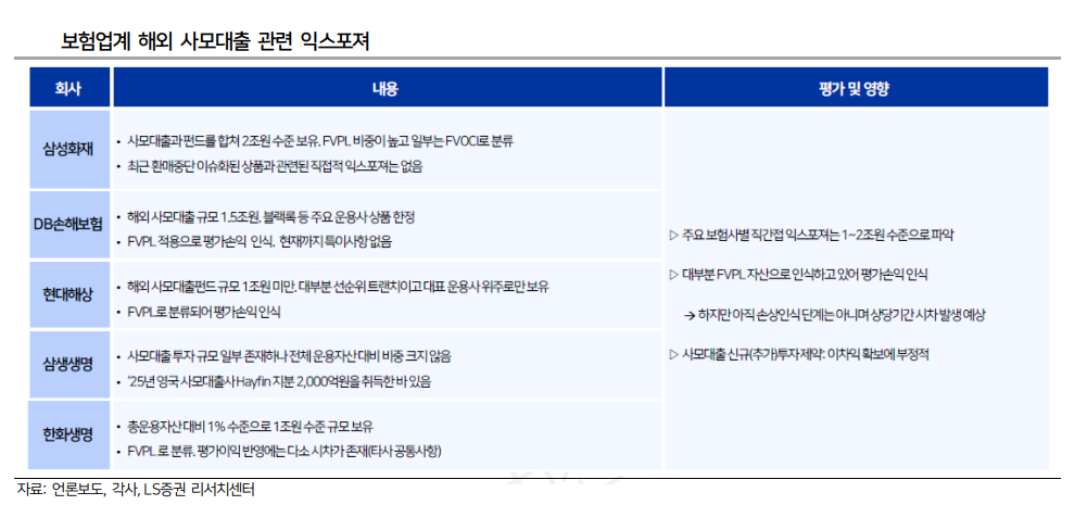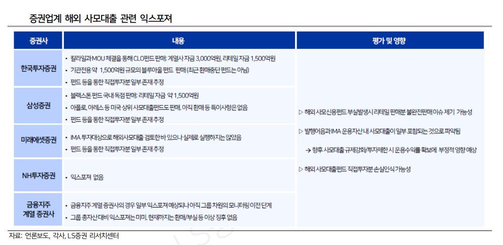 사모대출 관련 국내 금융권 익스포져는 일부 증권사와 보험사가 보유하고 있어 향후 부실이 표면화될 경우 관련손실 인식 및 운용수익률 저하가 예상된다.