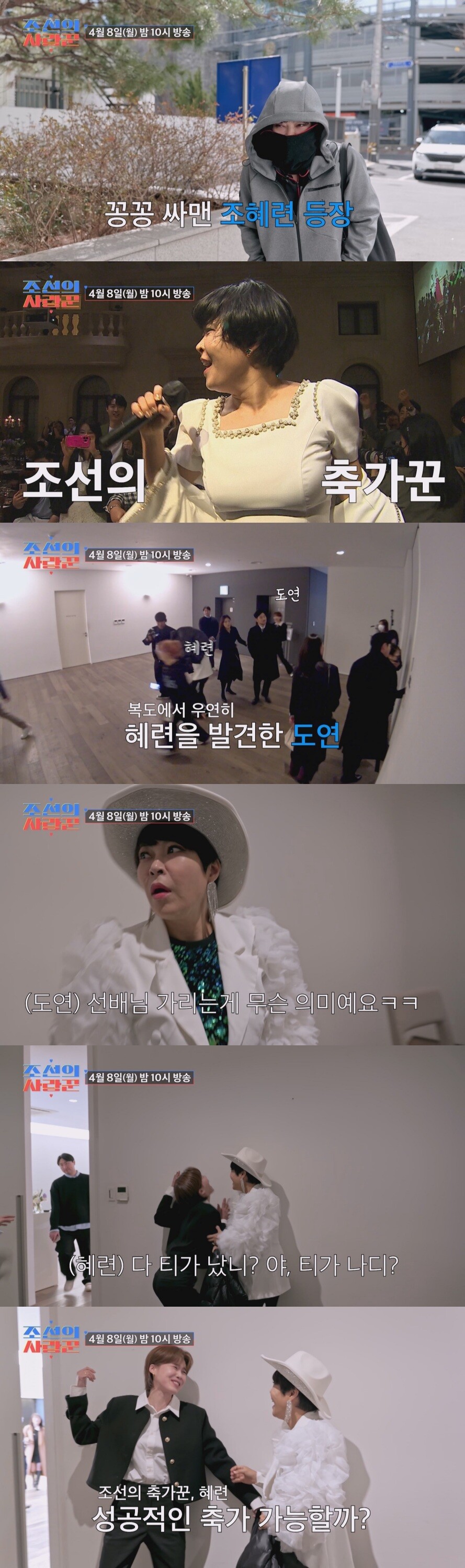 장도연은 “가리는 게 무슨 의미예요. 저 밖에서부터 선배님이었다”라며 조혜련의 정체를 한눈에 알아봤다. 연행되는 사람처럼 가렸음에도 허무하게 들키자 조혜련은 “다 티가 났니? 어떻게 하지…들키면 안 돼”라며 난처해하는 모습을 보였다.