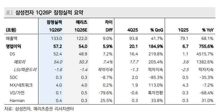 8일 금융투자업계에 따르면 삼성전자는 전일 잠정 공시를 통해 올해 1분기 매출 133조원, 영업이익 57조2000억원을 기록했다고 밝혔다.