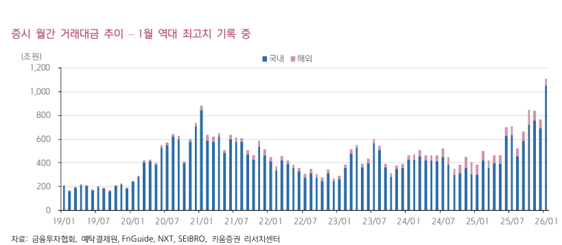 고연수 연구원은 "2026년 연간 국내증시 일평균 거래대금을 37조원으로 추정했으나, 1월 누적기준 57조원에 달하는 점을 감안하면 1분기 실적 발표 이후 리테일 부문의 실적 추정치 상향 가능성이 높다"라며 "특히 정부에서 코스닥 3000 달성 목표를 제시함에 따라 개인투자자 비중이 높은 키움증권에 우호적인 환경이 조성될 것으로 예상된다"라고 말했다.