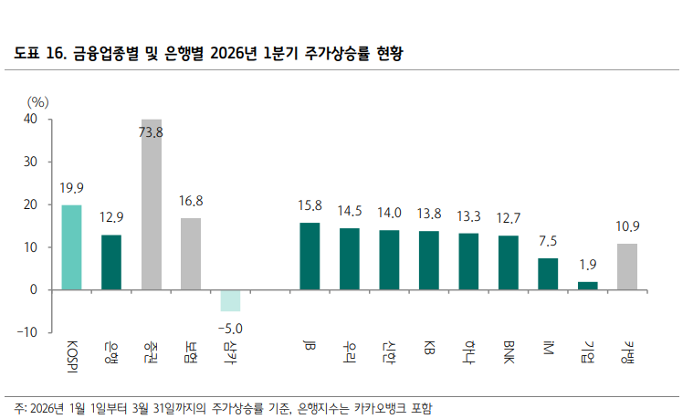박혜진 대신증권 연구원은 "중동지역 전쟁 영향으로 3월 국채금리가 크게 상승함에 따라 채권운용 수익이 감소하였고, 지수 역시 하락하여 은행의 매매평가익이 당초 전망보다 감소했다"라며 "실적 관련 커버리지 가운데 가장 주목할 기업은 KB금융으로 증권 브로커리지 수수료수익이 급증하며 지난해와 마찬가지로 비이자이익에서 약진할 것"으로 예상했다.