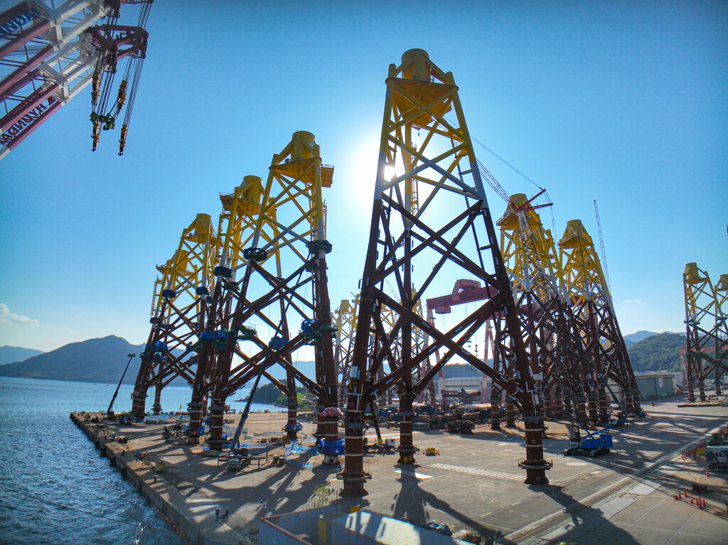 | SK오션플랜트가 제작한 세계 최대 규모 해상풍력 하부구조물(재킷)이 경남 고성군 소재 SK오션플랜트 사업장에 도열해 있다. (사진= SK오션플랜트 제공) |
