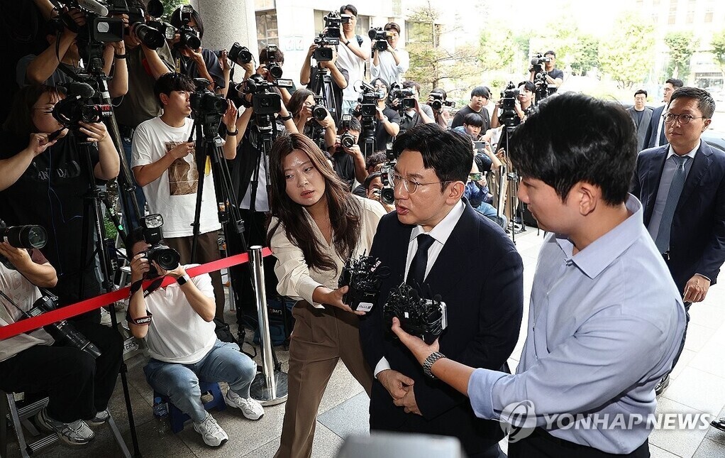 | 기업공개(IPO)를 앞두고 투자자들을 속여 지분을 팔게 한 의혹을 받는 방시혁 하이브 의장이 15일 서울 마포구 서울경찰청 금융범죄수사대에 피의자 신분으로 출석하고 있다. (사진=연합뉴스) |
