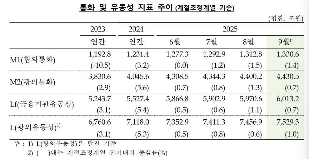 협의통화(M1)는 1.4% 증가한 1330조 6000억 원으로 집계됐다.