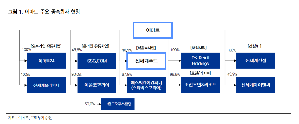 내부거래를 적극적으로 활용하면서 이마트와 시너지를 발휘할 수 있는 사업 전략에 더욱 치중할 수 있고, 전략적으로 계열사 합병이 이루어질 경우 SCK(스타벅스코리아) 및 온라인 사업부와의 협업, 부서 통합 및 전략적 재배치를 통한 효율화 작업이 가능할 것으로 판단되기 때문이다.