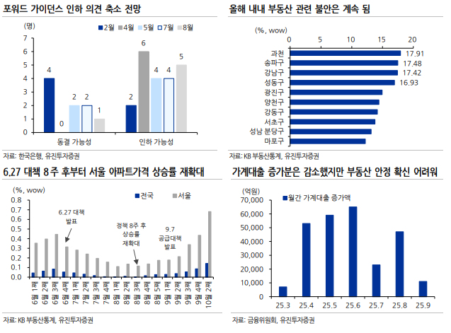 김지나 유진투자증권 연구원도 10월 기준금리 동결을 예상하며 10.15 부동산 대책 발표로 인해 11월 인하 가능성도 낮아졌다고 판단했다.