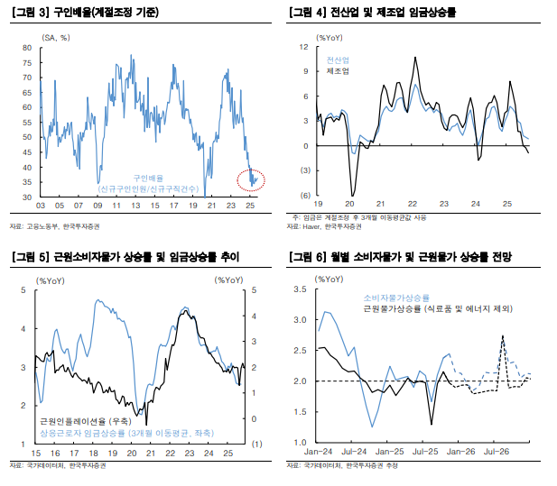 월별 고용지표와는 별개로 고용노동부에서 발표하는 구인배율(신규구인인원/신규구직건수) 또한 2025년 역사적으로 낮은 수준을 지속하고 있다. 전산업 및 제조업 임금 상승률 또한 약한 수준에 머물러 있다.