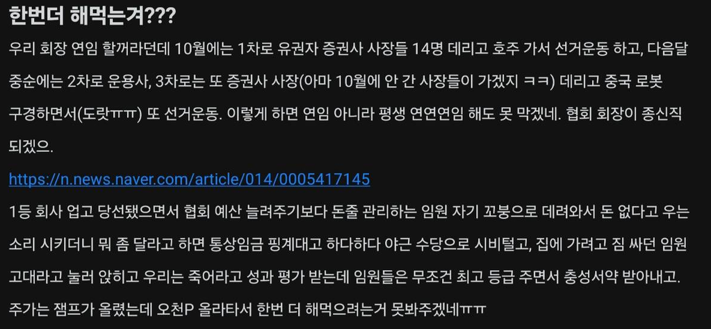 10일 직장인 익명 커뮤니티 블라인드에 따르면 금융투자협회 내부 관계자로 보이는 글쓴이는 “10월 1차로 유권자인 증권사 사장 14명과 함께 호주로 가고, 내달 중순 2차로 운용사 사장들과 함께 중국 로봇박람회(?)에 방문해 선거운동을 한다”면서 “이렇게 하면 협회장 연임이 아니라 종신직이 될 수 있다”고 비판 글을 게시했다.