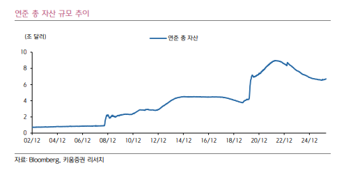 김일혁 KB증권 연구원은 "연준이 보유 국채를 매각하지 않고 만기 도래한 국채에 재투자하는 금액을 줄이는 방식의 양적긴축 (QT)를 추구하거나, 대차대조표를 더 확장하지 않아서 경제 규모나 은행의 총자산 대비 연준 자산의 비율을 낮추는 방식을 추구할 것"이라고 전망했다.