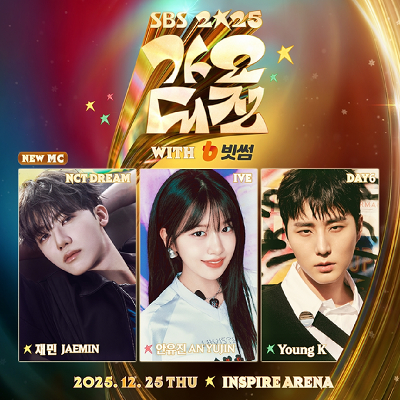 [알파경제=이고은 기자] '2025 SBS 가요대전 with 빗썸'(이하 'SBS 가요대전')이 오는 12월 25일 인천 인스파이어 아레나에서 개최되는 가운데, DAY6의 영케이(Young K), IVE의 안유진, NCT DREAM의 재민이 3MC로 확정됐다.