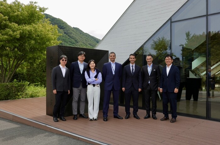 Saudi Arabian government delegation meets with Naver executives at the “GAK Chuncheon” Data Center in Chuncheon, Gangwon Province, on September 22. From left, third person: Chae Sun-joo, Head of Strategic Business at Naver, Chairperson of Naver Innovation and Naver Arabia RHQ; Ali bin Hadi Rajhi, Vice Minister of Saudi Arabia’s Ministry of Municipal, Rural Affairs and Housing; Rayan Alaql, CEO of NHC Innovation; Yasser Alobaidan, CEO of Balady; and Kim Yoo-won, CEO of Naver Cloud, pose for a commemorative photo. |