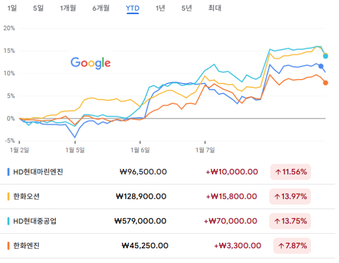이날 종가 기준으로 올해 수익률(YTD)은 ▲HD현대마린엔진 11.56% ▲한화오션 13.97% ▲HD현대중공업 13.75%, 한화엔진 7.87%를 각각 기록했다.